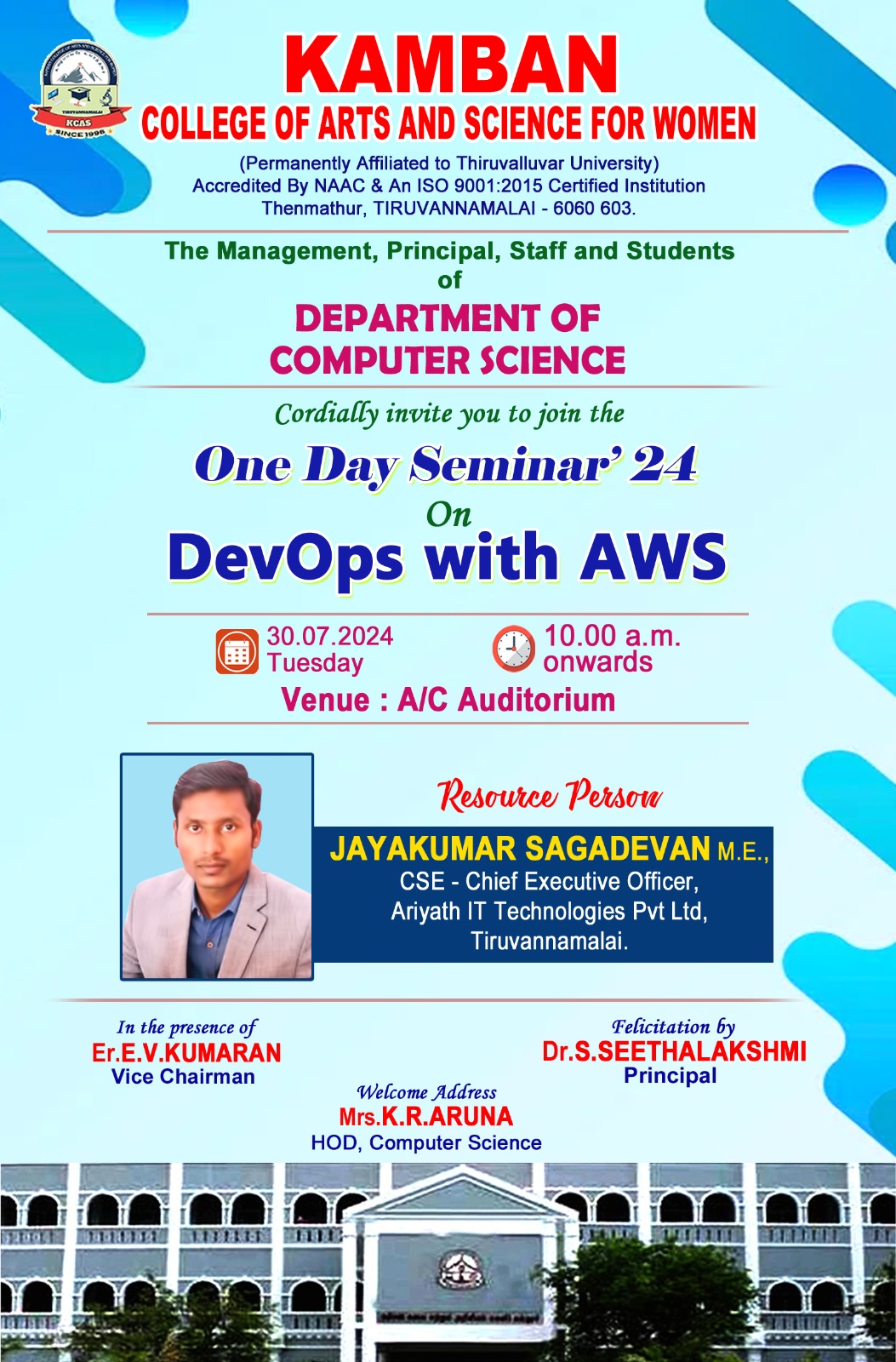 July 30, 2024August 1, 2024 College Staff DEPARTMENT OF COMPUTER SCIENCE CHIEF GUEST: JAYAKUMAR SAGADEVAN M.E., CSE – Chief Executive Officer, Ariyath IT Technologies Pvt. Ltd., Tiruvannamalai.