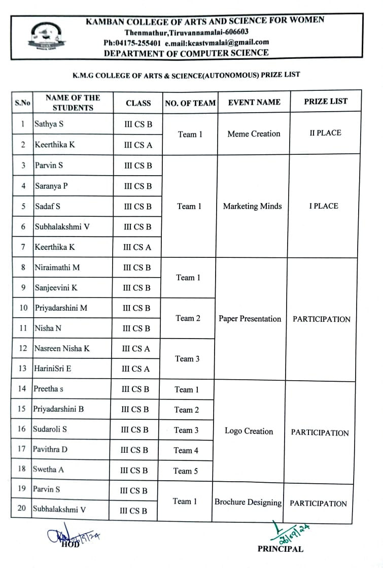 September 19, 2024September 27, 2024 College Staff ONE DAY NATIONAL SEMINAR @ KMG ARTS & SCIENCE COLLEGE,GUDIYATTAM (18/9/2),WINNERS LIST DEPARTMENT OF COMPUTER SCIENCE